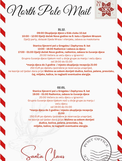 • NORTH POLE MAIL – Za vrijeme koncerta i gala večere za djecu će biti organiziran odvojeni prostor s posebnim programom i dječjim švedskim stolom (31.12. i 02.01.)***